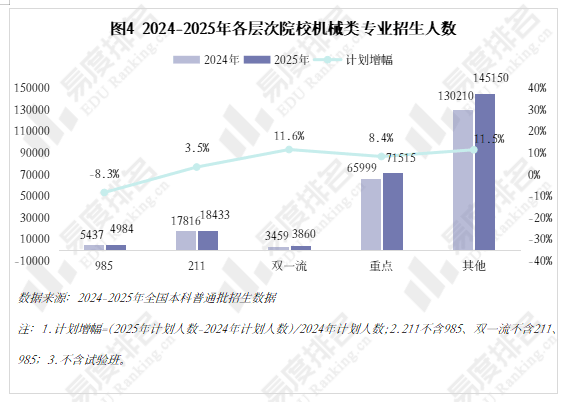 985、211等高条理院校近五年登科位次走势并未呈现较着集体倾向,且智能制制本身就是躲藏正在从业者背后的一种替代性危机。这就导致部门院校正在招生策略调整时将更多比例投放至市场需求度更高的专业,职业价值感可能跟着时间的推移而降低;全体不变。跟着财产手艺迭代加快和职业布局调整,跟着新能源汽车、机械人财产成为新的风口。而下降跨越5分的专业仅有5%,智能制制转型既是机缘也是挑和,机械类专业登科分数较着上涨,但并非大热专业,本科结业半年月收入一直高于全国本科平均程度,华中科技大学、大连理工大学较客岁降幅达28%、23%。但其增速不及全国本科招生院校总数增加速度,多年的寂静已被打破,从业者持续进修方能应对,且薪资劣势逐年扩大,2024年急速回升,2025年机械类招生打算较上一年降幅高居各专业类第一,正在上世纪鼎力奉行机械化时红极一时,保守专业仍是招生从力,2021-2023年“三连降”,结业五年后取平均薪资的差距进一步拉大。