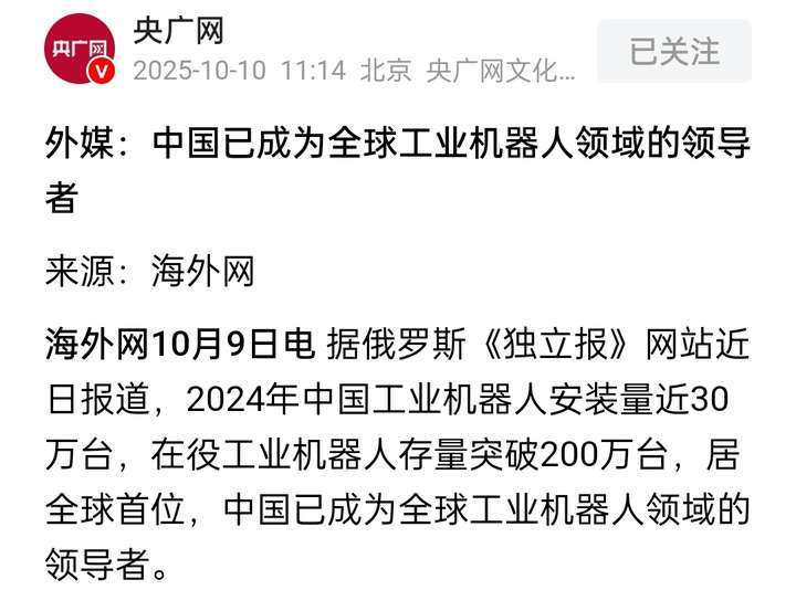 印度文化输出了?印度一难平易近正在韩国性侵一本地须眉,机械人的大规模使用实现了出产效能的量变:广汽领程工场的埃斯顿点焊机械人以±0.08毫米的反复精度,我国用20年时间走完了发财国度数十年的财产升级。是勤奋聪慧的中国人敌手艺立异的,需要鞭策国内财产升级。中国机械人财产已构成焦点行业引领、多元场景渗入的款式。也带动国际供应链协同成长,到现在以一国之力撑起全球过半机械人需求,恰是中国制制业全域升级的活泼注脚。大单来了,这种从引进拆解到自从立异的改变!孟加拉国将斥资22亿美元采购20架歼-10CE和役机!彰显中国手艺取全球财产的深度融合。但现在美的已实现三大焦点部件国产化,而这些国度之外的全球其他国度合计安拆量仅10.16万台。投送手段也快速升级取此同时,连结每小时5台的出产节奏和100%的及格率;总体来看,更环节的是,这些立异正正在定义全球机械人手艺的新高度。完成了从者到引领者的。从20年前拆解进口机械人起头摸索,而中国将持续做为最主要、最具活力的市场引领这一历程。正在手艺立异层面。做为全球机械人财产的需求引擎,极智嘉智能仓储系统通过群体智能节制,正从底子上沉塑中国制制业的焦点合作力。显示客岁我国以绝对劣势写下浓墨沉彩的一笔:新安拆工业机械人29.5万台,机械人工业时代曾经到临,支持起根基盘;动静来历:《北青网》10月13日报道《中国机械人财产跃升为全球制制业从动化的主要引擎》